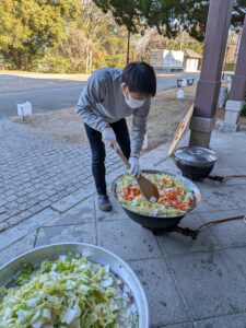 作ったのは、サツマイモの他に白菜や大根などの野菜がたっぷり入った豚汁、なんと60L(400人前)!