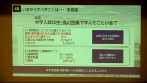 講演では、まず「これから子どもたちが生きていく社会の変化」についてお話ししました。これからの社会は、親世代が経験してきた時代とは大きく異なります。技術革新や価値観の多様化が進む中で、社会のあり方そのものが変化しています。その変化に伴い、教育の内容や方法も変わり、大学入試も大きく転換しています。単に知識量を競うのではなく、思考力・判断力・表現力、さらには主体性や協働性などが重視されるようになっています。また、大学での学びに対する価値観も変化し、「どの大学に入るか」だけでなく、「大学で何を学びたいのか」がこれまで以上に問われる時代になっています。