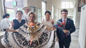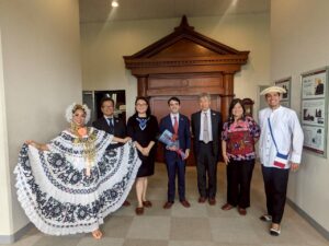 総領事館からアレハンドロ・デ・レオン総領事、アニー・ラム・チョン副領事、中西様、そしてサンドラ・チャン大阪・関西万博パナマパビリオンディレクター、万博で来日中のプロダンサーのお二人をお迎えしました。