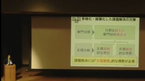山根様からは、まず「文理」について、単に文系か理系を選ぶだけではなく、これからの社会における課題解決には“文理双方の視点=複眼的な考え方”が求められること、また学問領域が幅広く交差し、大学における学びが多様化していることについて、具体的な大学の事例を交えてご説明いただきました。