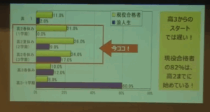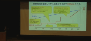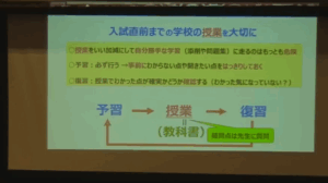 後半では、現役合格を目指すうえで今から意識すべき学習姿勢や、日々の学習計画の立て方、第一志望合格までのスケジュール管理、模試の活用法などについて、合格者の実例をもとに具体的なアドバイスをいただきました。また、国公立大学の後期日程や私立大学の3月入試など、最後まで挑戦できる選択肢についても触れられ、「最後まであきらめないことの大切さ」を強調されました。