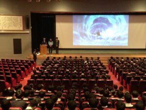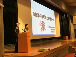 自転車でも重大事故を起こす可能性があることをデータを示しながらお話しして頂き、生徒たちは熱心に耳を傾けていました。