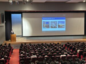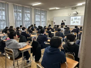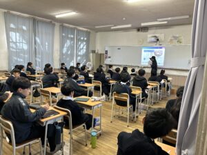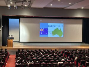 ニュージーランド姉妹校(TNIS)研修の参加者は、中学1年生の各教室にて報告会を実施しました。オーストラリア姉妹校(GMAS)研修やターム留学の参加者、そしてDDP(日米高卒資格取得プログラム)の受講生たちは、小寺ホールにて中学2・3年生に向けてプレゼンテーションを行いました。
