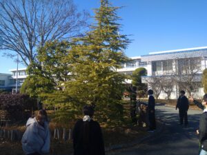 ソーラー充電式のLED電球を使用したイルミネーションで高校校舎前の木々に飾り付けをしました。今年は、三田市内で地域交流や地域活性化を目的に活動している学生団体の「こみんか学生拠点」の皆さんの協力のもと電飾を設置しています。2月ごろまで設置していますので、夕方にご来校の際には是非ご覧ください。